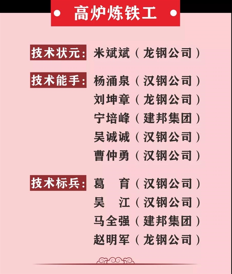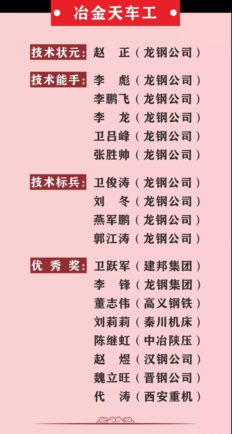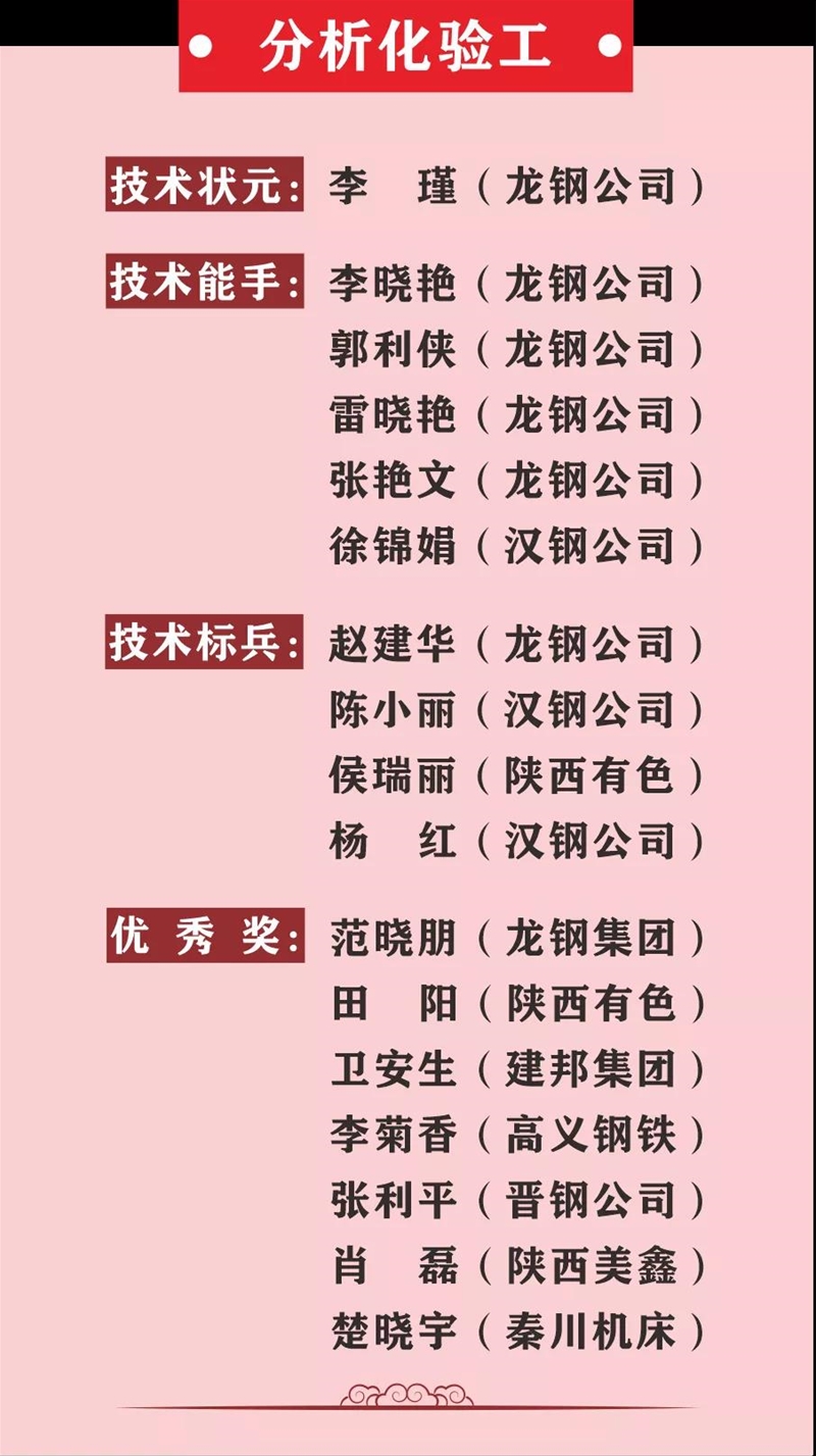 薛繼虎宣布表彰決定。本次競(jìng)賽,來自陜西省機(jī)械冶金建材系統(tǒng)11家參賽單位以及西北聯(lián)鋼3家山西鋼鐵企業(yè)的137名參賽選手,經(jīng)過3天的激烈角逐,最終在高爐煉鐵工、冶金天車工、分析化驗(yàn)工、維修鉗工4個(gè)工種競(jìng)賽中產(chǎn)生了陜西省機(jī)冶建材系統(tǒng)“技術(shù)狀元”4名、“技術(shù)能手”20名、 “技術(shù)標(biāo)兵”16名,其中分析化驗(yàn)工和冶金天車工兩個(gè)工種競(jìng)賽還產(chǎn)生了“優(yōu)秀獎(jiǎng)”15名,并在閉幕式進(jìn)行表彰頒獎(jiǎng),還表彰了優(yōu)秀組織單位和優(yōu)秀組織個(gè)人。對(duì)獲得本次大賽高爐煉鐵工、冶金天車工前3名的選手將由組委會(huì)推薦省有關(guān)單位授予“陜西省技術(shù)能手”稱號(hào)。