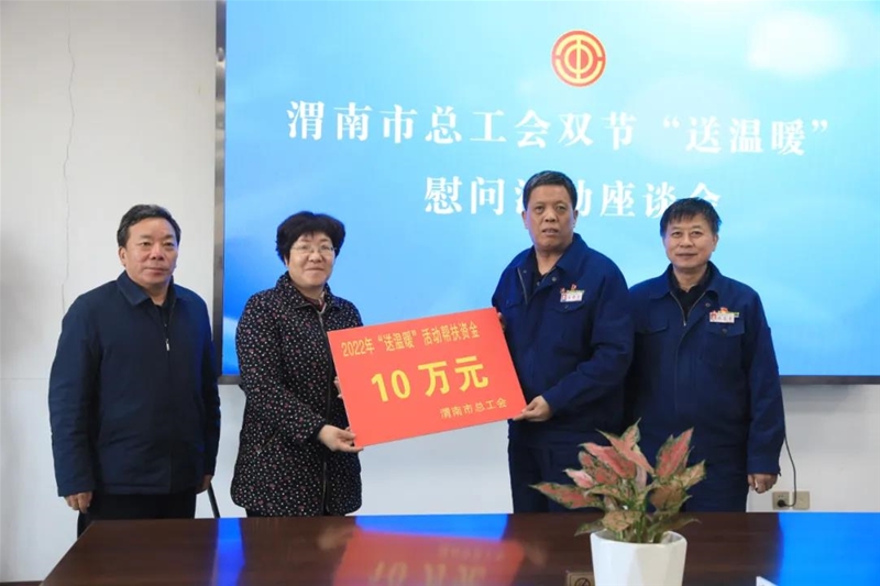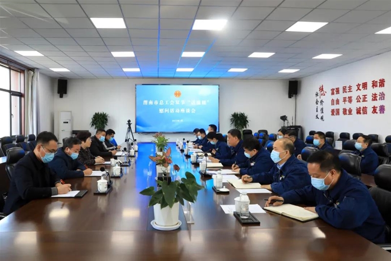 1月18日,渭南市總工會黨組書記、常務(wù)副主席侯雪靜,韓城市總工會常務(wù)副主席李養(yǎng)義一行來公司“送溫暖”,并召開座談會。公司黨委副書記、總經(jīng)理李都宏,黨委委員、工會主席趙春棠,各基層工會主席、相關(guān)部門負責(zé)同志參會。