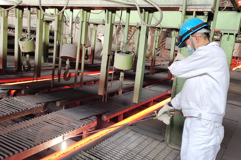 在4#連鑄機(jī)臺(tái)下,兩名拉矯剪切工正在輥道旁切割三流的連角,切割人員一手拿著割槍,一手半遮住面部,在鋼坯的炙烤下他們額頭上滲出汗水,但他們卻沒有一絲動(dòng)搖,依然雙目不移,緊緊握著割槍切割,認(rèn)真而謹(jǐn)慎,在火花飛濺中快速且標(biāo)準(zhǔn)地將連角切斷,只為確保割縫在標(biāo)準(zhǔn)范圍內(nèi),降低消耗。剛切割完鑄坯的他們顧不上額頭上的汗水,走向定尺桿的位置,抬起定尺桿,三步并作兩步跨越輥道,對(duì)溫度最高的中間流紅坯進(jìn)行長(zhǎng)度測(cè)量,動(dòng)作統(tǒng)一、干脆利落。為了保證鑄坯的定尺合格率達(dá)到100%,像這樣的場(chǎng)景一班下來(lái)需要重復(fù)五六次,但,他們卻沒有任何怨言,默默堅(jiān)守在自己的崗位,為降本增效做出自己的貢獻(xiàn)。