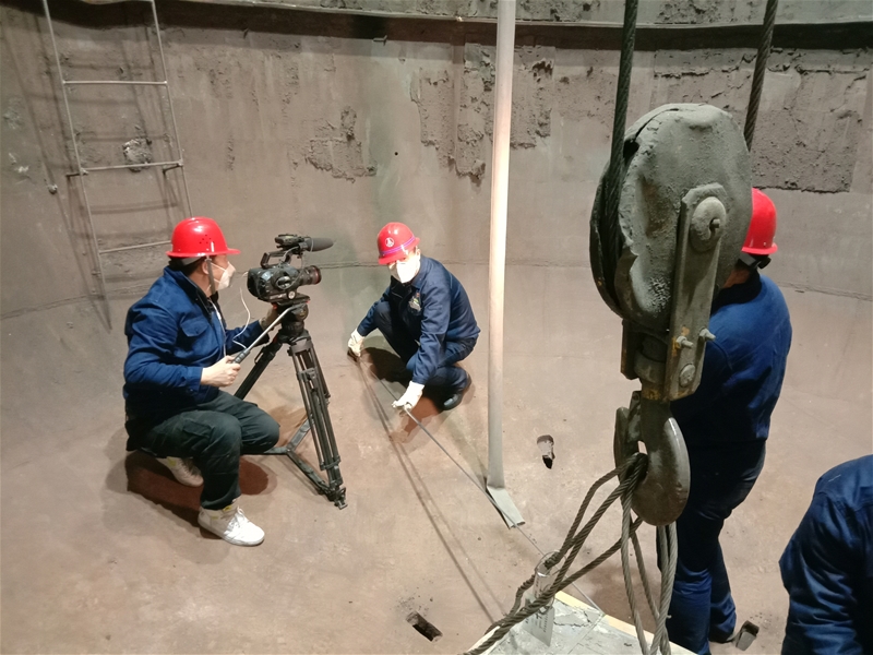 3月7日14:25,拍攝組在漢鋼公司煉鋼廠1#轉(zhuǎn)爐爐內(nèi)砌磚環(huán)縫封閉拍攝。