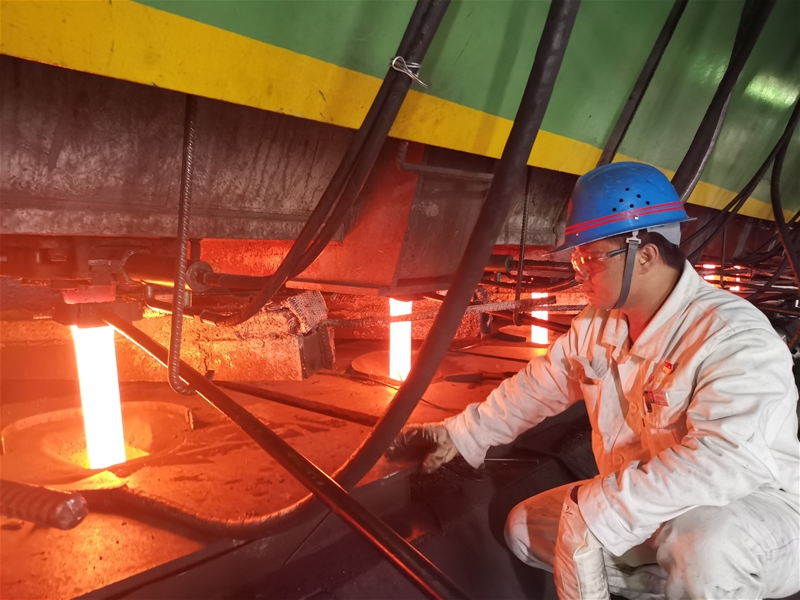 奔涌的鋼水、飛濺的鋼花、炙熱的紅坯……在連鑄生產(chǎn)車間的角角落落,無不體現(xiàn)著熱烈、奮進的激情。春末夏初之際,連鑄生產(chǎn)一線溫度持續(xù)攀升,煉鋼人熱情高漲,他們與鋼水為伍、與高溫相伴,為實現(xiàn)“雙目標(biāo)”,堅決打贏“三大翻身仗”全力以赴。看,滾滾的鋼水前,他們一次次測量著鋼水溫度;飛濺的鋼花中,他們相互協(xié)作更換中包套管;火熱的紅坯旁,他們守護著“火龍”前進;緊張的檢修中,他們一秒也不敢耽擱……測溫、排渣、澆鋼、換水口、切割紅坯……這些看似簡單的工作,其實需要頑強的毅力和過硬的操作技能才能完成。煉鋼、練人、煉魂,盡管工作艱苦,但是他們沒有一人喊苦叫累,對于每一項工作,他們都全力以赴,在煉鋼中冶煉非凡的鋼鐵人生。