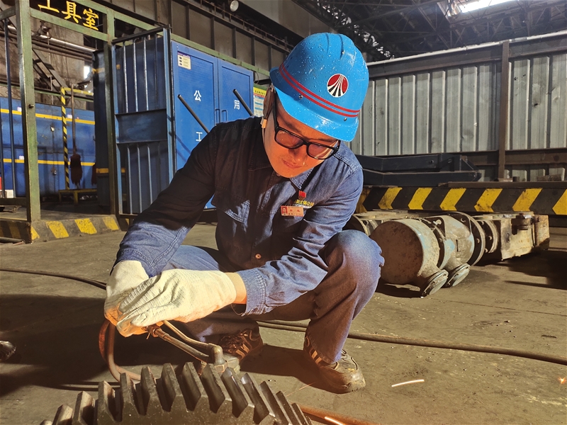 “幫忙拉一下線,我再往切前輥道那里挪一下……”為了能盡快配合完成檢修任務,田凱已顧不上擦拭臉上的汗水,他一只手握著焊槍,一只手舉著面罩,認真地焊接著切前輥道處的輪轂,此時濺起的焊花將他胸前的黨徽照得更加光亮。