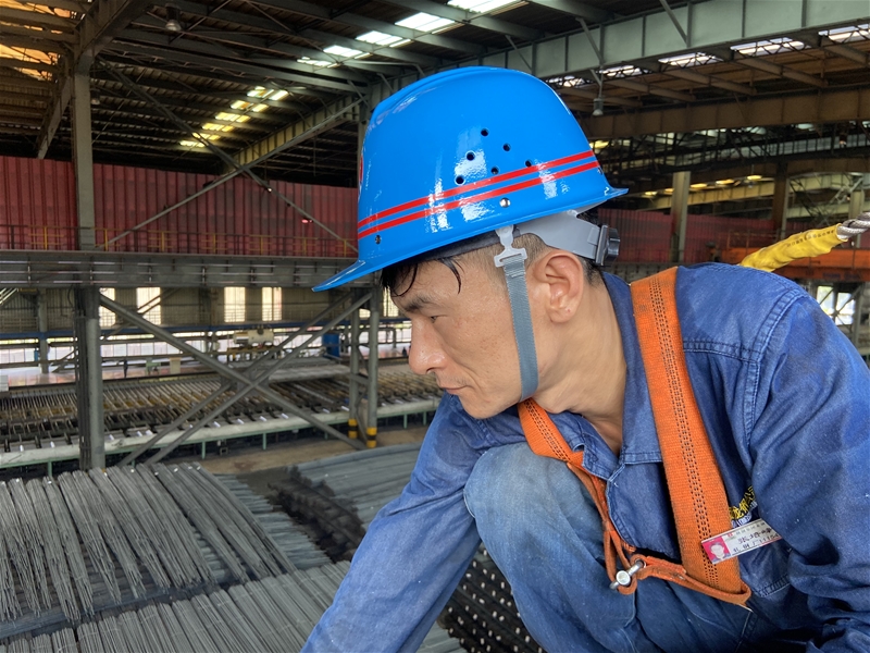 圖三:距離軋線20米的高空,剛剛完成車輛點檢的行車工梁波正駕駛著天車忙碌地進行鋼材出庫,起吊、穩(wěn)鉤、下落……動作一氣呵成,嫻熟而輕巧,盡管已是滿頭大汗,但他堅定的目光里,有的只是對崗位滾燙的熱愛。