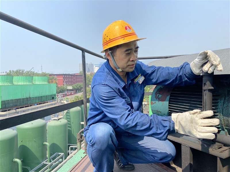 圖四:高達15米的冷卻塔塔頂,安全員楊利民正在對冷卻塔減速機油位進行檢查,他用專注與敬業(yè)護航著設(shè)備順行,守護著員工安全。