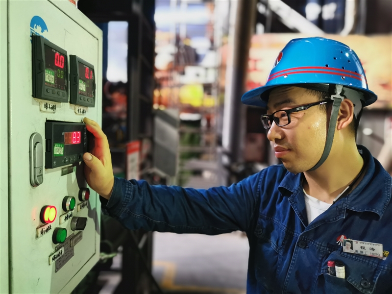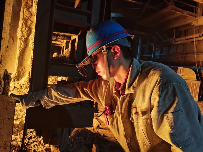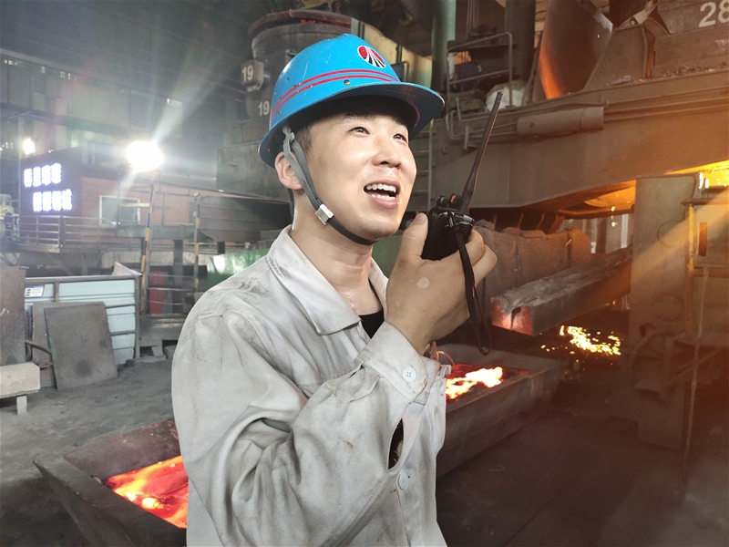 圖八:煉鋼廠連二作業(yè)區(qū)6#連鑄機(jī)中包工何武濤正在對(duì)在線水口、機(jī)件進(jìn)行檢查。面對(duì)眼前1500℃的鋼水,他眼戴護(hù)目鏡,身穿阻燃服,在汗流浹背中守護(hù)著安全生產(chǎn)。