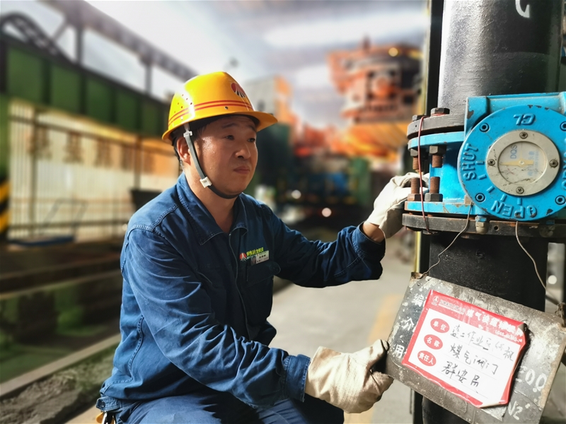 圖三:煉鋼廠連二作業(yè)區(qū)安全員張保銀正在檢查煤氣設(shè)備,現(xiàn)場(chǎng)的溫度持續(xù)攀升,汗珠順著他的臉頰滾落,但是他始終牢記自己的職責(zé)與使命,不放過任何一個(gè)細(xì)節(jié),用實(shí) 際行動(dòng)踐行著自己的安全誓言。