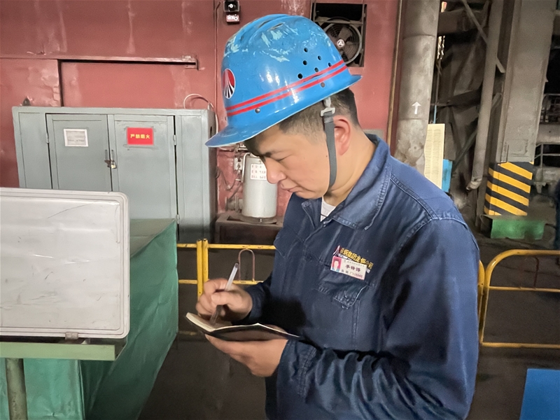 圖九:煉鋼廠天車作業(yè)區(qū)天車工李鋒博在記錄設(shè)備運(yùn)行情況,他所在的出坯垮地面全是1000℃的紅坯,熱量持續(xù)往上方擴(kuò)散,臉上的汗珠往下滑落,不變的是他對(duì)設(shè)備的認(rèn)真負(fù)責(zé)。