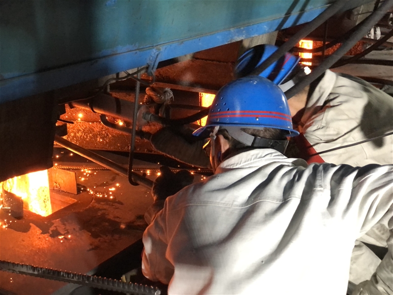 圖二:煉鋼廠連二作業(yè)區(qū)安檢員郭云峰正在對(duì)拉矯系統(tǒng)進(jìn)行檢查,火紅的鋼坯從他的腳邊緩緩穿過,盡管他全身被烤得微疼,但他的眼睛始終聚焦在運(yùn)轉(zhuǎn)的設(shè)備上,不敢有一絲懈怠。