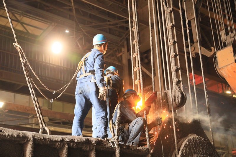 圖十二:煉鋼廠天車作業(yè)區(qū)鉗工盧陳強(qiáng)、郭新民和趙亞龍正在進(jìn)行換繩作業(yè),他們默契又快速地?fù)Q了一根新的鋼絲繩,他們就像這新的鋼絲繩一樣,在高溫環(huán)境里緊緊擰在一起,為生產(chǎn)順行貢獻(xiàn)自己微薄之力。