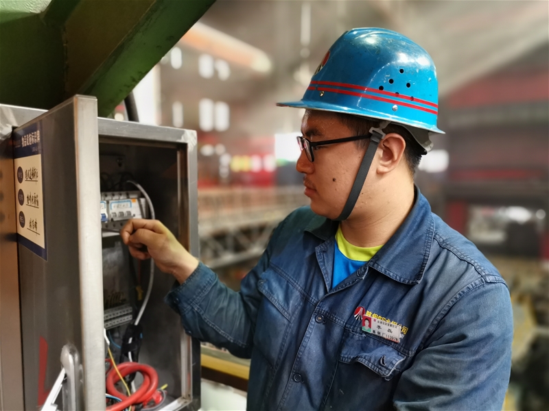 圖四:煉鋼廠轉(zhuǎn)爐平臺(tái)上電儀作業(yè)區(qū)電工李磊正在對(duì)配電柜線路進(jìn)行檢查,滾滾熱浪撲面而來,他身上的汗腺像被擰開了的開關(guān),瞬間汗如泉涌。