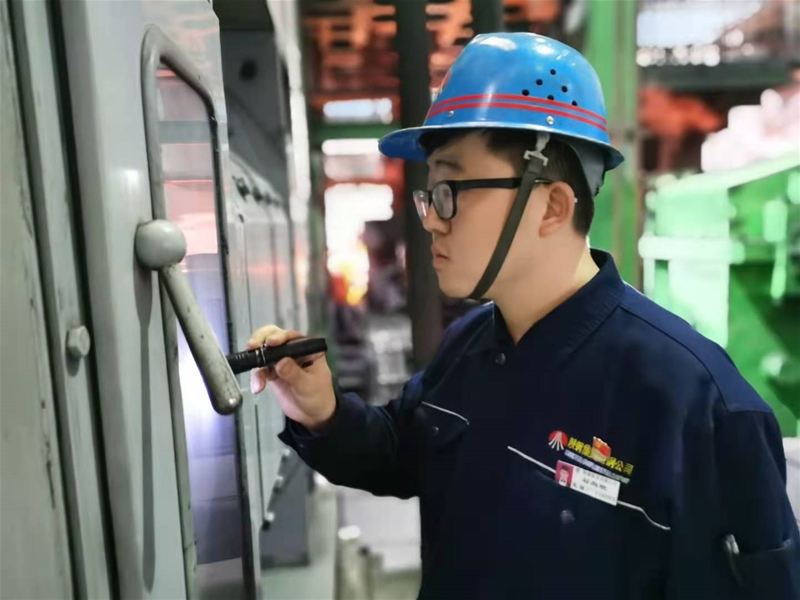 緊張有序地換輥作業(yè)結束后,卜丹一邊擦拭汗水一邊喝水,眼睛還時不時盯著軋機的方向,他一口氣喝完杯中的涼開水,走進值班室接滿一杯,放下杯子,拿上對講機,迅速來到軋機旁,聚精會神地對軋制質量、設備等情況進行觀察,只見他時而彎腰用手電查看設備運轉情況,時而站立在軋機旁仔細觀察著軋制板型,手中緊握著對講機,以便及時向操作臺反饋信息。在“蒸籠般”的環(huán)境中,即使毛巾都擦拭黃了,衣服能擰出水來,卜丹仍舊穿梭在軋機之間,只為確保產品質量和生產順行。