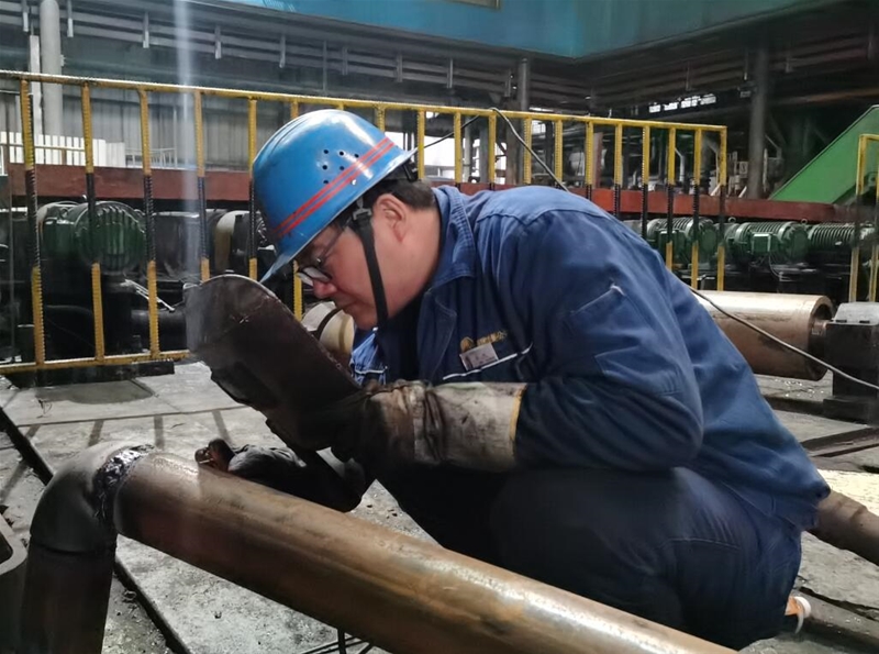 走進(jìn)軋鋼工序板帶作業(yè)區(qū)卷曲下料處檢修現(xiàn)場(chǎng),鏗鏘敲擊聲、焊花四濺。鉗工馬龍頭戴安全帽,目光如炬,正在焊接下料平臺(tái)架子,周圍的冷空氣360度無(wú)死角彌漫,他全然不顧,忙得不亦樂(lè)乎。