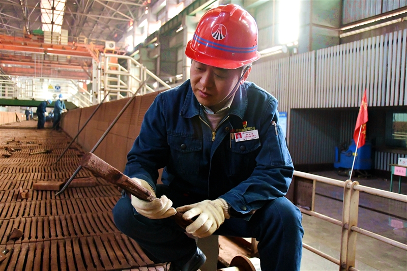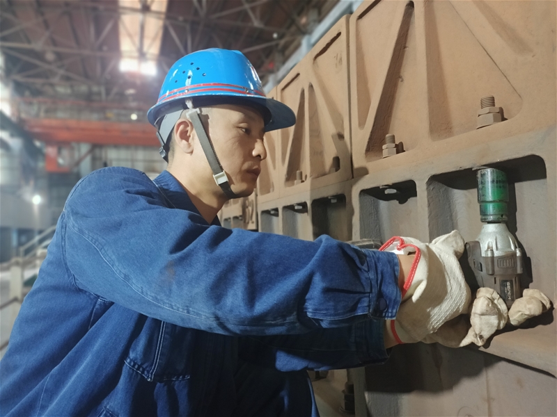265㎡燒結機臺車檢修現(xiàn)場,129塊臺車,每塊臺車上有30個螺栓。3870個螺栓在配料班長王黎的巧手操作中,一個個迅速、精確歸位。一天下來,王黎的胳膊、雙手早已酸痛無比。“只要能夠保證檢修質量,自己再苦再累都值得。”他笑著說道。
