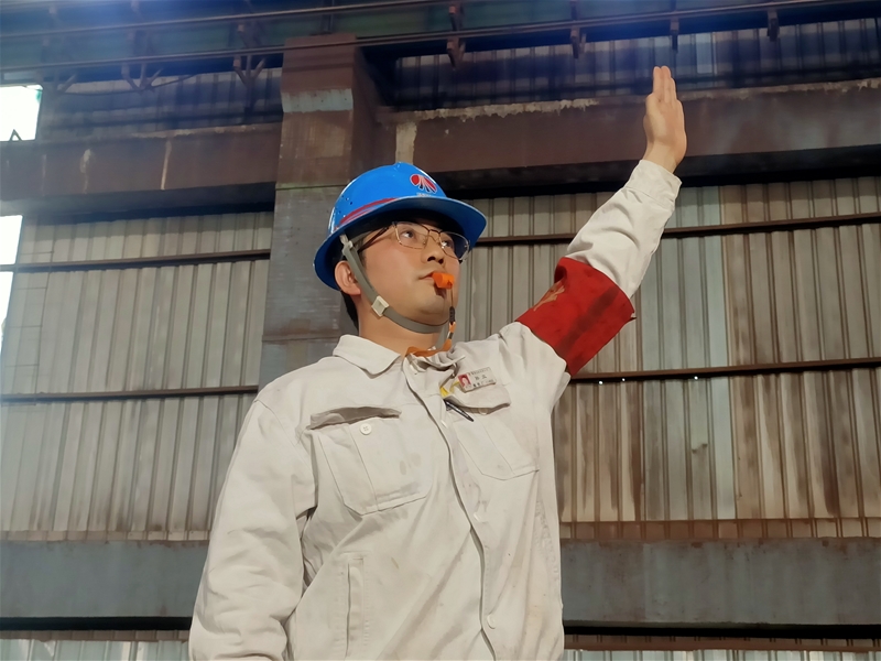 安全監(jiān)護人員孫立臂戴紅袖章,口含沖鋒哨,在臺車平面的行車下,手勢規(guī)范,指揮幾十噸重的行車,就像一名高空作業(yè)“交警”,全面保障檢修人員安全。