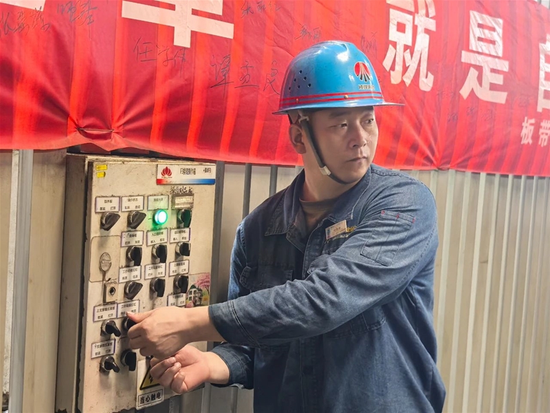 上午8:10,激烈而緊張的換輥“競(jìng)賽”正式開始,只見“參賽者”的身影穿梭在現(xiàn)場(chǎng),仿佛4×100游泳接力賽場(chǎng)上你追我趕的運(yùn)動(dòng)員。軋鋼工緊密協(xié)作,動(dòng)作嫻熟,每一個(gè)步驟都精準(zhǔn)無誤。王煜和范宇坤負(fù)責(zé)拆卸舊輥,并配合天車工將需要更換的軋輥慢慢從軋機(jī)中抽出來,放置在下線軋輥指定地點(diǎn)。李陽和楊延博配合默契,負(fù)責(zé)吊運(yùn)新輥以及安裝調(diào)試工作,只見一人負(fù)責(zé)操作箱操作,一人根據(jù)其指示小心翼翼地操作按鈕,調(diào)試后再仔細(xì)檢查,確保導(dǎo)衛(wèi)和除塵水管完好無損。精軋班長(zhǎng)蓋俊生則負(fù)責(zé)檢查換輥質(zhì)量,整個(gè)過程每一個(gè)人都恪盡職守、全力以赴,每一個(gè)環(huán)節(jié)都如同接力賽中的一棒,傳遞著責(zé)任與使命。