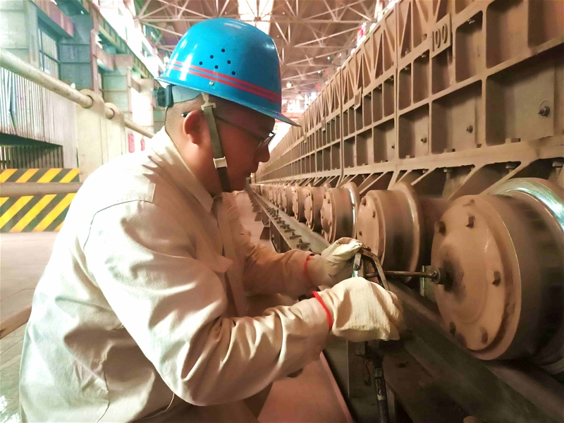臺車軌道旁,臺車工薛峰虎正在對臺車滾輪區(qū)域設備進行潤滑保養(yǎng),129個臺車見證了他日復一日的堅守,50℃的高溫環(huán)境“烤”驗著他,擺動帶、寬皮帶、燒結機、臺車小格……見證了他矢志不渝奮斗的青春足跡。