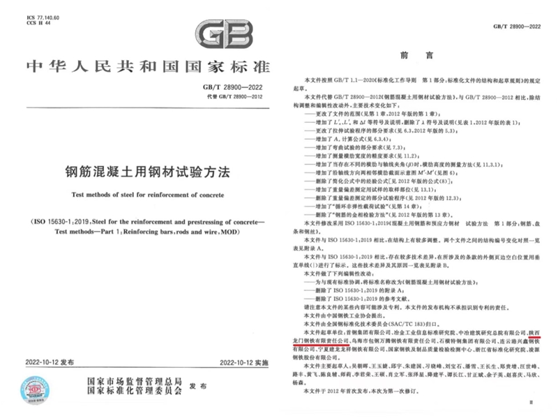 近日,由龍鋼公司參與起草的《GB/T28900-2022鋼筋混凝土用鋼材試驗方法》正式發(fā)布。