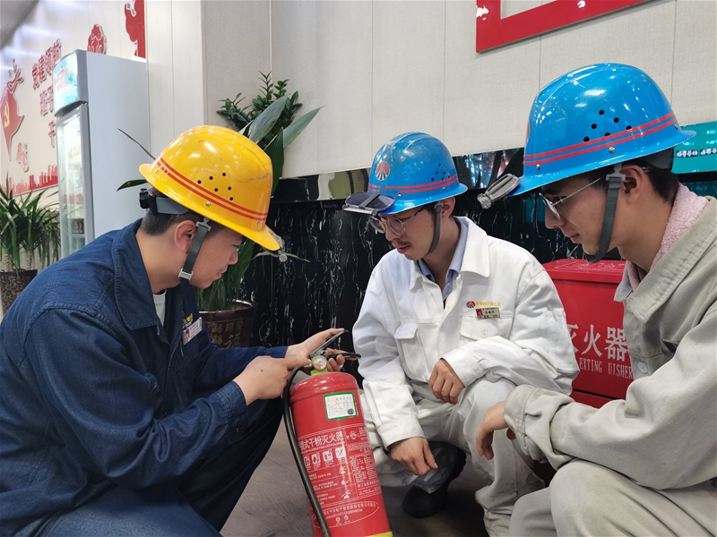 “這個滅火器還有半年過期,注意看儀表顯示,這是處于正常使用狀態(tài)。如果指針指到這個位置,滅火器就失效了,需要及時更換。”安全員王萬星針對如何正確使用滅火器向各班組人員詳細講解道。