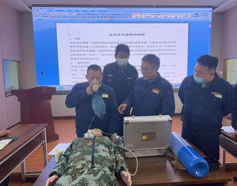 “自動蘇生器是一種能自動進(jìn)行正負(fù)壓人工呼吸的救援裝置,它能把含有氧氣的新鮮空氣自動輸入傷員肺內(nèi)。”氣體防護(hù)中心副主任、注冊安全工程師呂永剛從自動蘇生器的性能、適用范圍、工作原理、操作要領(lǐng)、使用注意事項(xiàng)、日常檢查和維護(hù)六方面,進(jìn)行了深入淺出地講解和演示,并結(jié)合救援實(shí)際案例,用通俗易懂的語言,為參培人員講解應(yīng)急救援處置的基本技能、救援要點(diǎn)和注意事項(xiàng)。