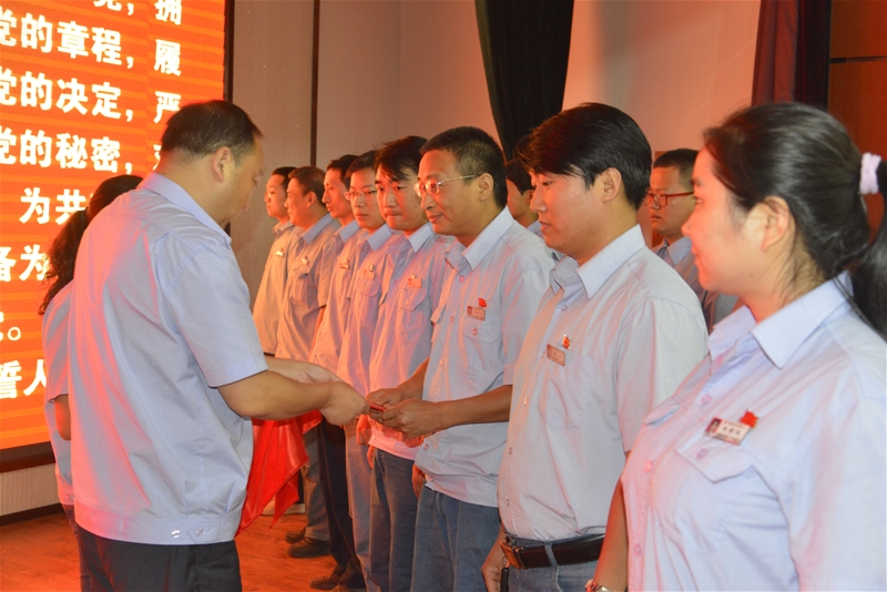 表彰了煉鋼廠黨總支等16個先進基層黨組織,田學智等8名優(yōu)秀黨務工作者以及戶百武等15名優(yōu)秀共產(chǎn)黨員。先進黨組織代表機關(guān)黨總支和優(yōu)秀共產(chǎn)黨員代表侯增棟分別做了交流發(fā)言。杜東興為18名新黨員發(fā)放了黨章,全體與會人員重溫了入黨誓詞。
