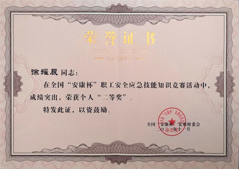 近日,公司喜獲全國“安康杯”職工安全應急技能知識競賽活動“優(yōu)秀組織單位”榮譽稱號。公司職工徐耀辰榮獲二等獎。
