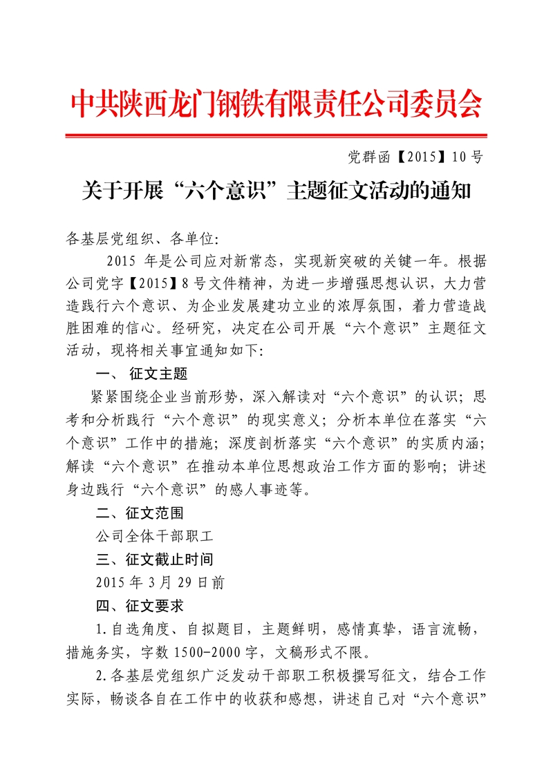 中共陜西龍門鋼鐵有限責(zé)任公司委員會(huì) 關(guān)于深入開展“六個(gè)意識(shí)”思想教育活動(dòng)的通知