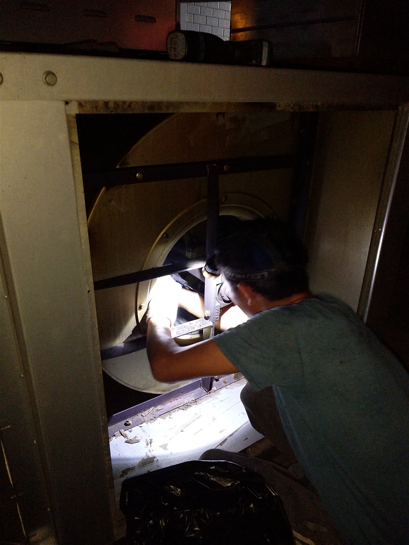 7月15日,晚上10點(diǎn)15分,最后一波客人離開(kāi)賓館,煙道清洗人員立即對(duì)煙道及煙罩采取冷卻處理。12點(diǎn)鐘,煙道清洗工作正常開(kāi)始,賓館廚師、保障部人員顧不上一天的勞累,積極參與到煙道的清洗工作中,拆卸煙罩擋板、風(fēng)機(jī)葉片,引導(dǎo)清洗人員對(duì)整個(gè)油煙管道進(jìn)行認(rèn)真、細(xì)致的清洗。今年盛夏的高溫來(lái)得異常猛烈,此刻的地面正散發(fā)著蒸籠一樣的熱氣,汗水浸濕了在露天地拆除油煙管道的他們的衣衫和脖子上的毛巾,煙道里那種由丙烯醛、苯、甲醛、巴豆醛等有害物質(zhì)組成的氣味夾雜著地面散發(fā)的熱浪,直逼得人透不過(guò)氣來(lái),在煙道跟前待上十幾分鐘,就要在空氣好的地方稍作休息,但是他們沒(méi)有一個(gè)喊停的,主動(dòng)輪流操作,確保各種清洗設(shè)備都能按照標(biāo)準(zhǔn)得到清洗。為了不影響第二天的正常接待,凌晨3點(diǎn)半又要開(kāi)始對(duì)正在清洗的煙道進(jìn)行安裝,為5點(diǎn)鐘早餐做好準(zhǔn)備。