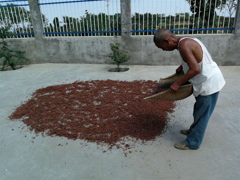 中午吃飯的時候,爺爺就不見了,只聽見院子里“嚓嚓嚓”的聲音,隨即我來到院子里看見爺爺在收花椒,摸了摸花椒還沒干就問爺爺:“爺爺,花椒還沒曬干怎么就收了。”爺爺說道:“這曬花椒不能曬的太干了,太干了花椒就碎了,不好脫籽”說著爺爺已經將花椒掃成一堆,用木扒將花椒輕輕地拍打,使花椒籽從花椒上脫離出來,隨后將大部分花椒用木扒扒出來晾曬,剩下的花椒和籽混在一起不好分離,這時候爺爺就用簸箕將花椒和籽用他的多年技術給分離出來??粗鵂敔敻傻暮貌粺狒[我也試著干了一會,發(fā)現花椒粒沒有從花椒籽里分出來,它們還是混在一起,看來這個活還得慢慢積累經驗。