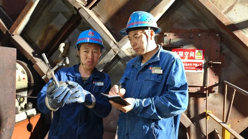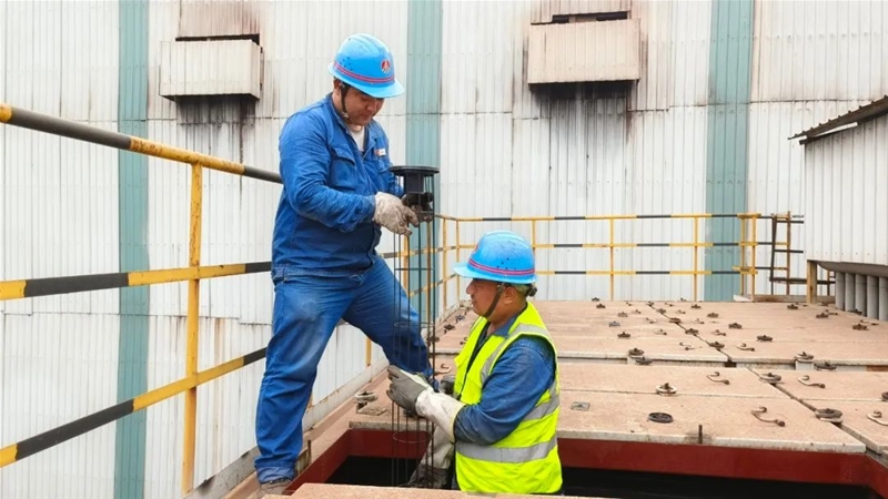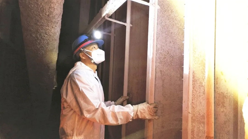 在完成通風(fēng)、氧含量和有害氣體檢測(cè)合格后,閆剛強(qiáng)“全副武裝”,對(duì)自己的勞護(hù)用品和安全工器具再一次確認(rèn),帶頭鉆進(jìn)40cm×50cm的長(zhǎng)方形人孔門,身著密不透風(fēng)的防塵服穿梭在40℃的電場(chǎng)內(nèi)部。兩臺(tái)除塵器8個(gè)電場(chǎng)的檢查任務(wù),讓他已無(wú)暇顧及艱苦的作業(yè)環(huán)境,僅半個(gè)電場(chǎng)就有21排極線、22排極板、22個(gè)振打錘。每一個(gè)他都要檢查陰極線有無(wú)彎曲斷裂、陽(yáng)極板有無(wú)脫槽、定位板有無(wú)脫落,振打錘有無(wú)磨損……確?;芈吠暾蛯?dǎo)線連接牢固。